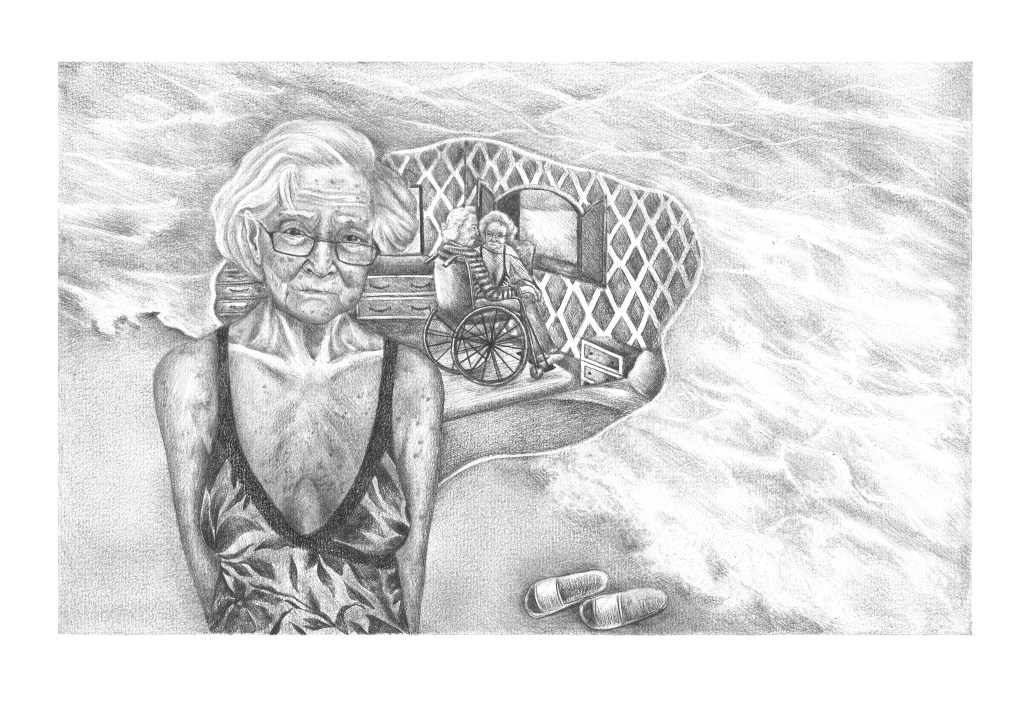 La Maria camina descalça per la platja. Amb el cap cot, respiració cansada i caminar feixuc, deixa que les onades toquin els seus peus, uns segons abans que aquestes morin per sempre més. No mira a res ni a ningú, mentre ressegueix la costa que l’ha vist néixer, créixer, fer-se gran i ara ja envellir. Les arrugues de la Maria li dibuixen les línies d’una cara que abans havia estat plena de somriures i de mirades càlides. Aquestes arrugues li continuen per tot el cos, des de les que té al coll, seguint per les de l’espatlla i les que li arriben fins a uns pits caiguts que ja no recorden quan havien estat turgents. La producció irregular de melanina també dibuixa a la Maria unes taques que té escampades per tot el cos, però que semblen invisibles tan per ella com per la gent que passa pel seu costat.